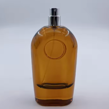 Một chai nước hoa thủy tinh sang trọng với một cơ sở sâu tròn và một nắp vàng